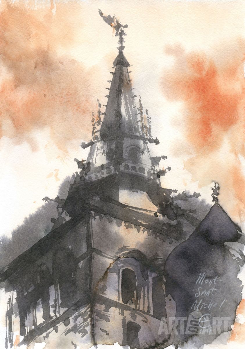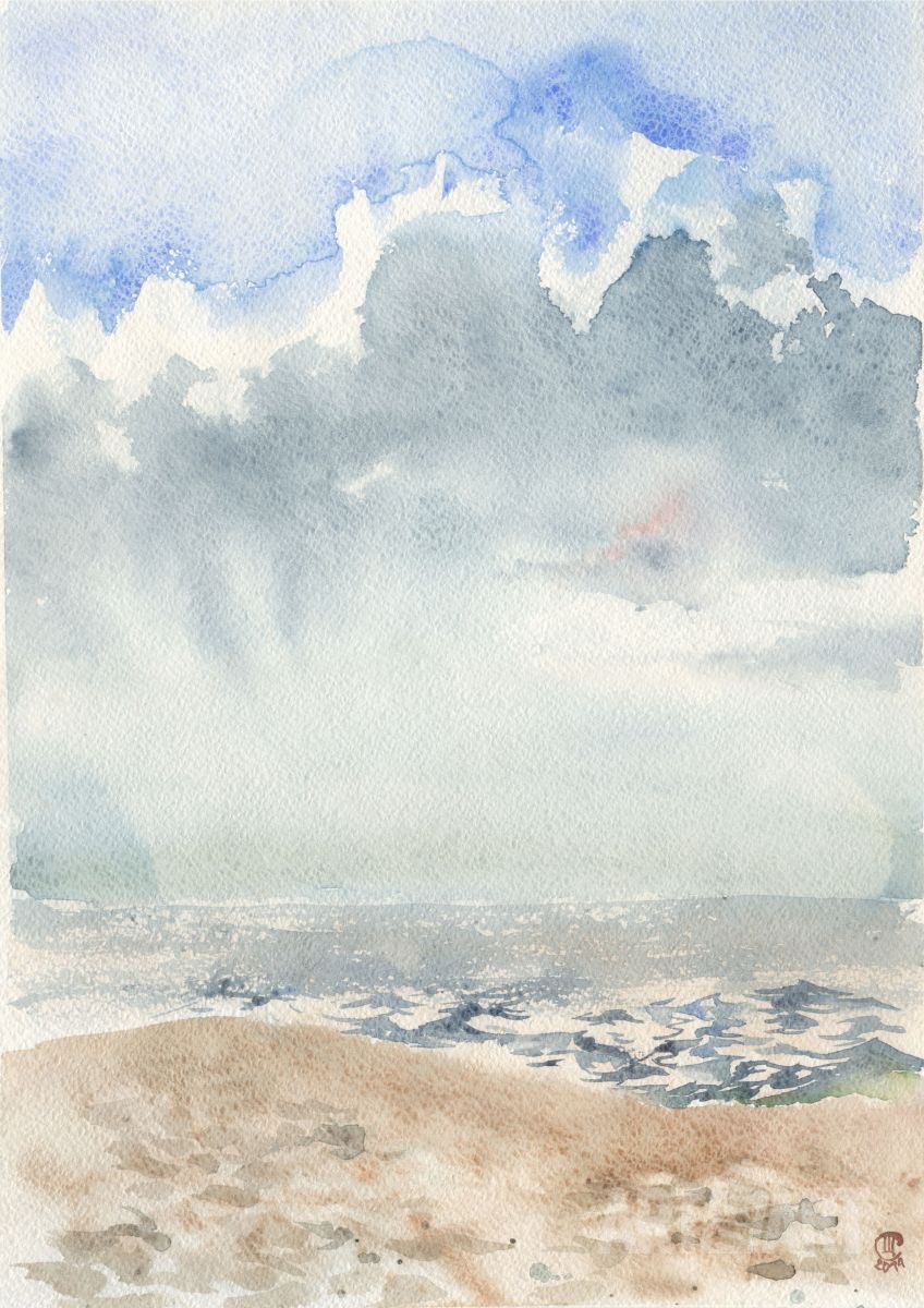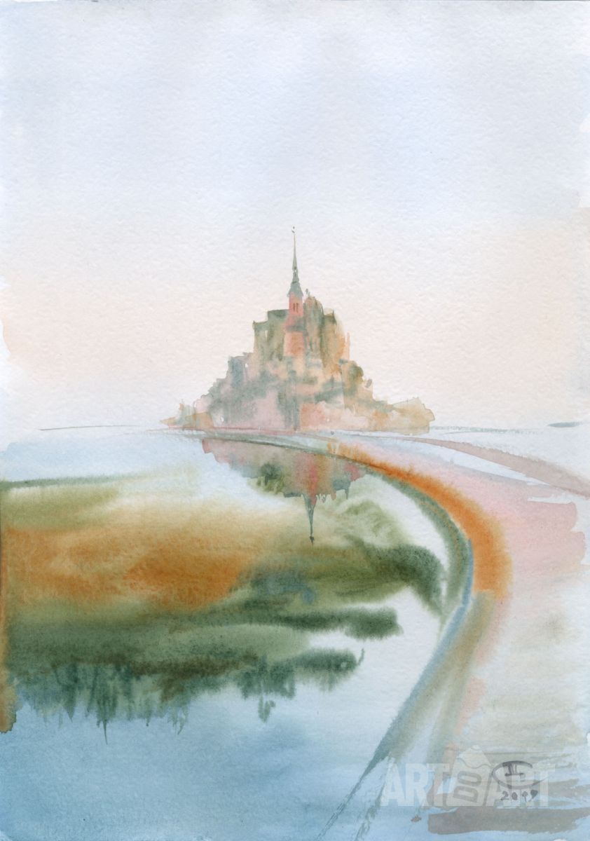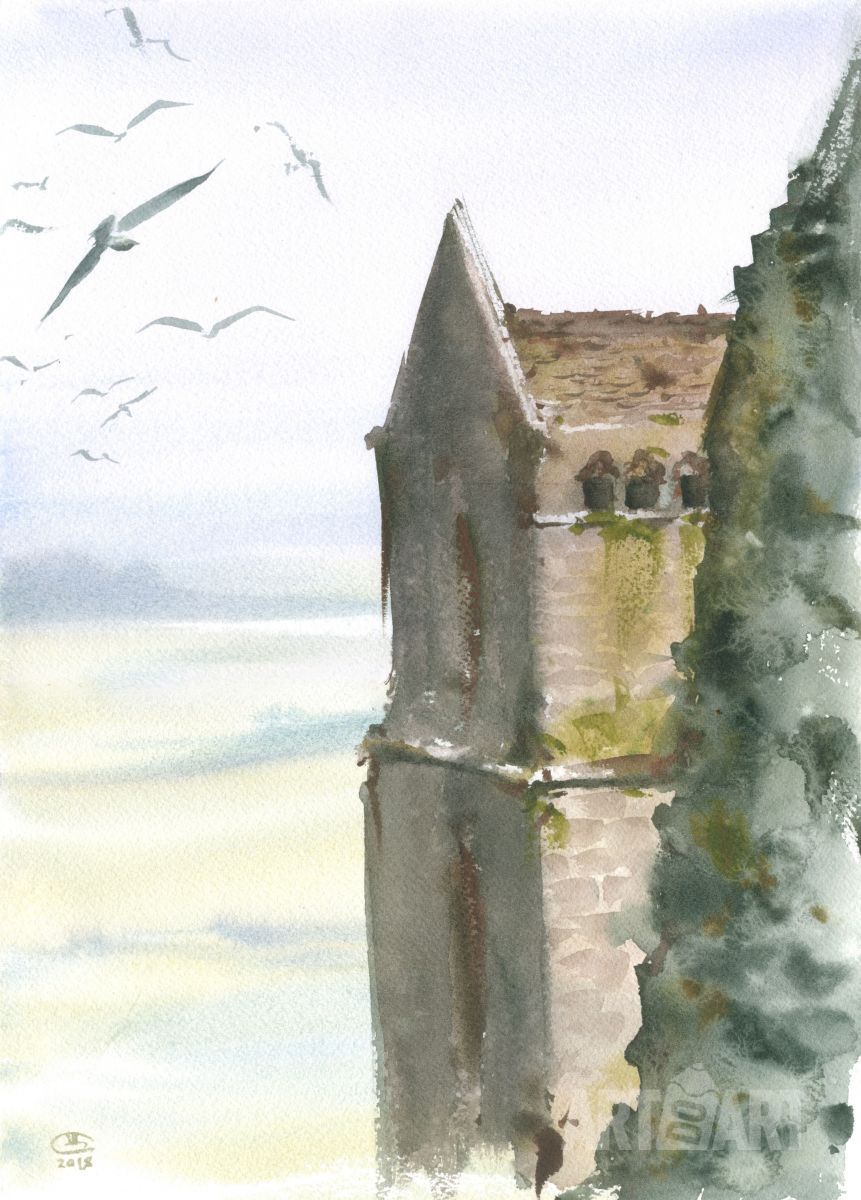Mother of pearl and pink moments of spring; branches of blooming almonds stand in a glass vase on a table covered with a tablecloth with flowers. Watercolor made on cotton paper.
