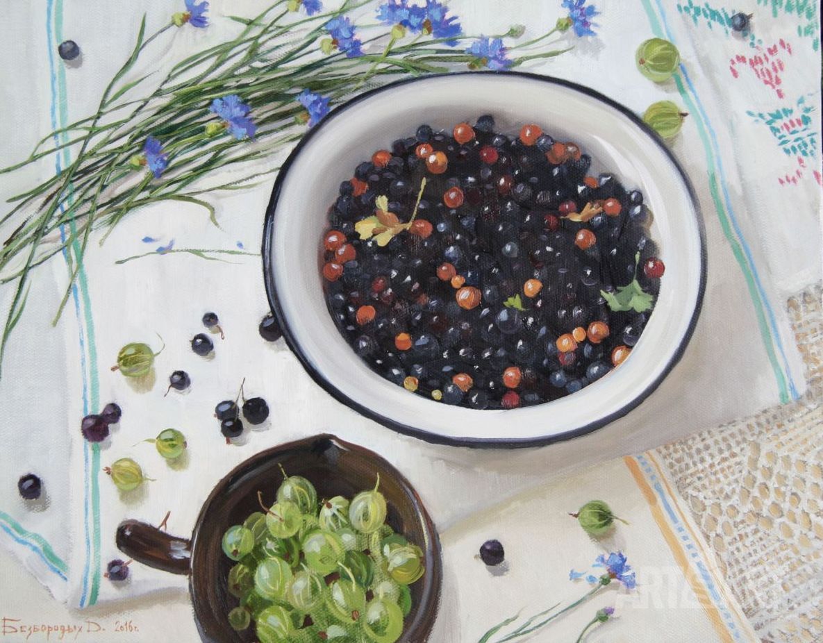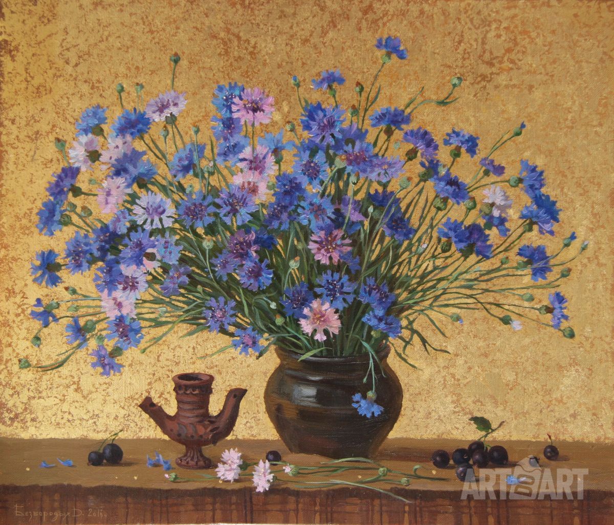 Symbolic still life . Golden ears, bread and milk are traditional symbols of Russian life , its age-old way of life , its spiritual wealth. Traditional Russian Krynki , embroidered with cornflowers towel, woven from bast solonitsy (salt shakers , which took with them to work in the field) are depicted. The ears are gilded with real gold leaf.
