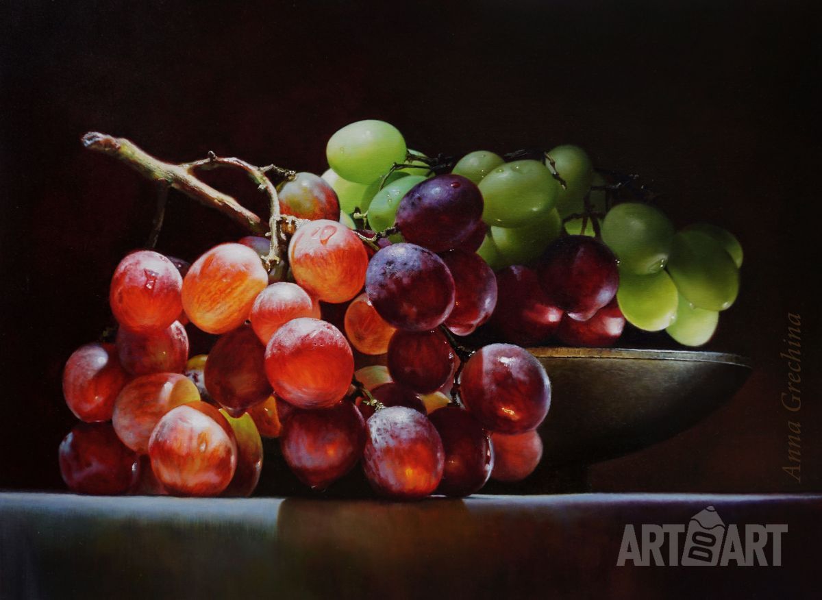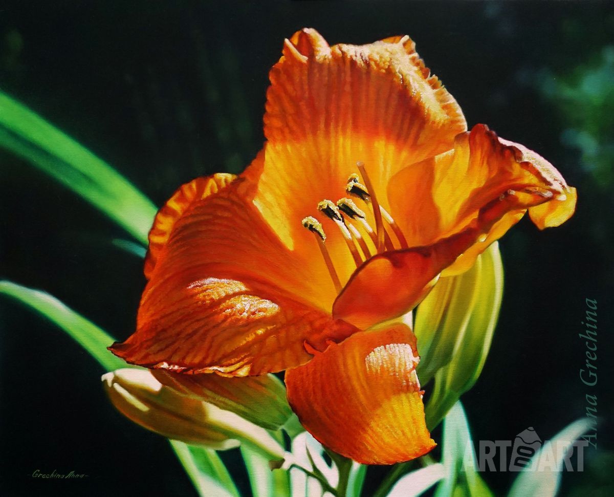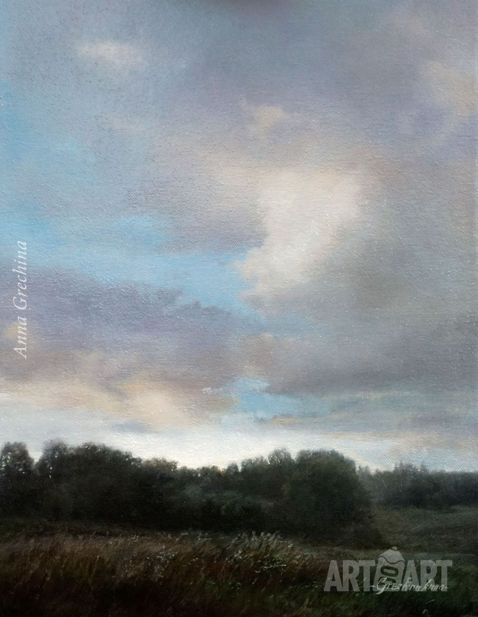 Bluebells, rocks, windy weather. The picture is painted in oil on a wooden panel in the technique of «hyperrealism» («photorealism») with maximum elaboration of details. It is decorated in a wide volume double frame with a mat effect. The size of the work is 36h46sm.