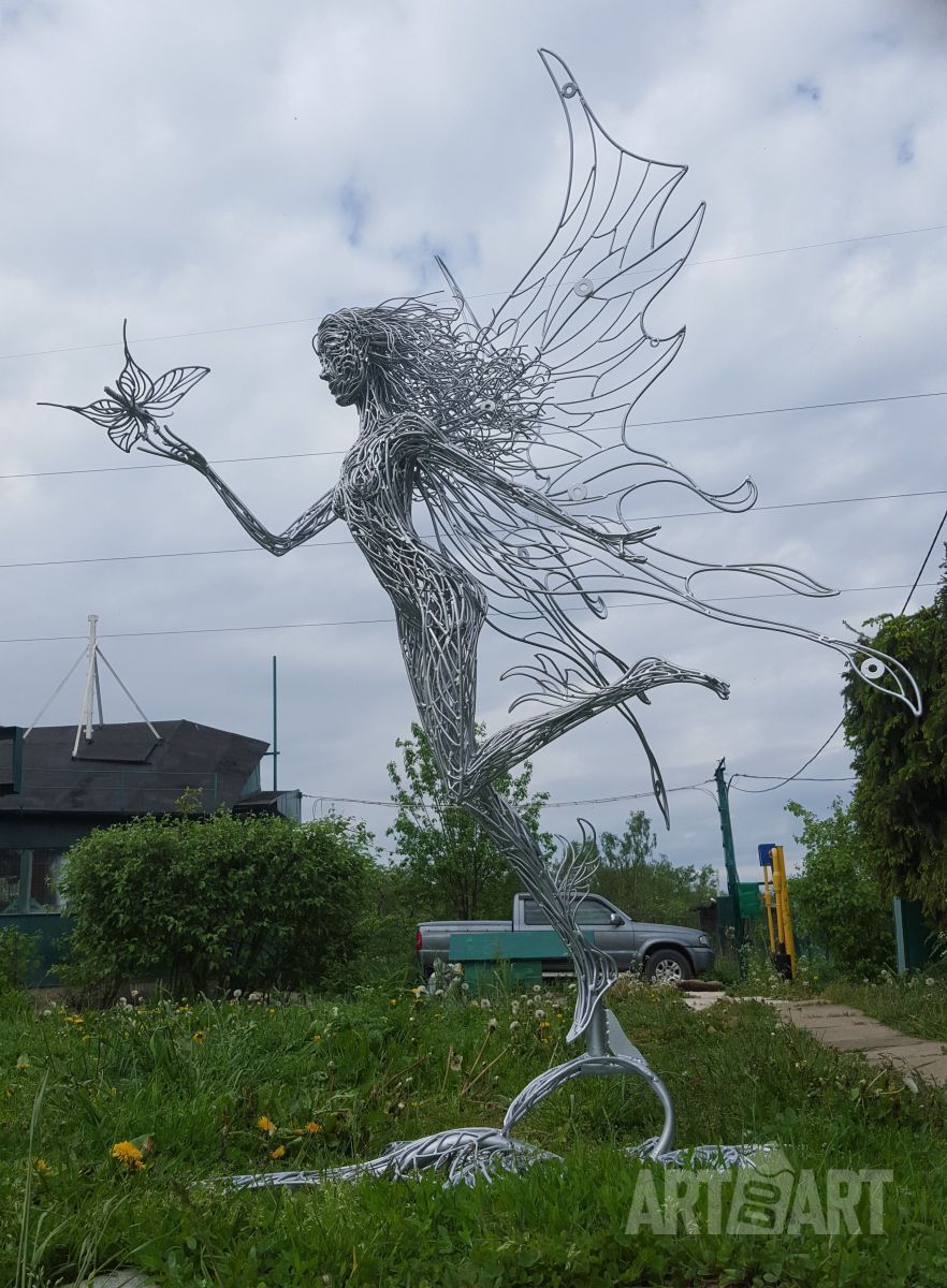 The fiower fairy sculpture is made in the bionic technique, it is an organic interweaving of forns that create a romantic image of a fairy girl from branches, leaves andflowers. In front of us, the fairy froze in a moment of emotional excitement, she looks at the bright world of flowers surrounding her, which she creates herself end is a part of it.