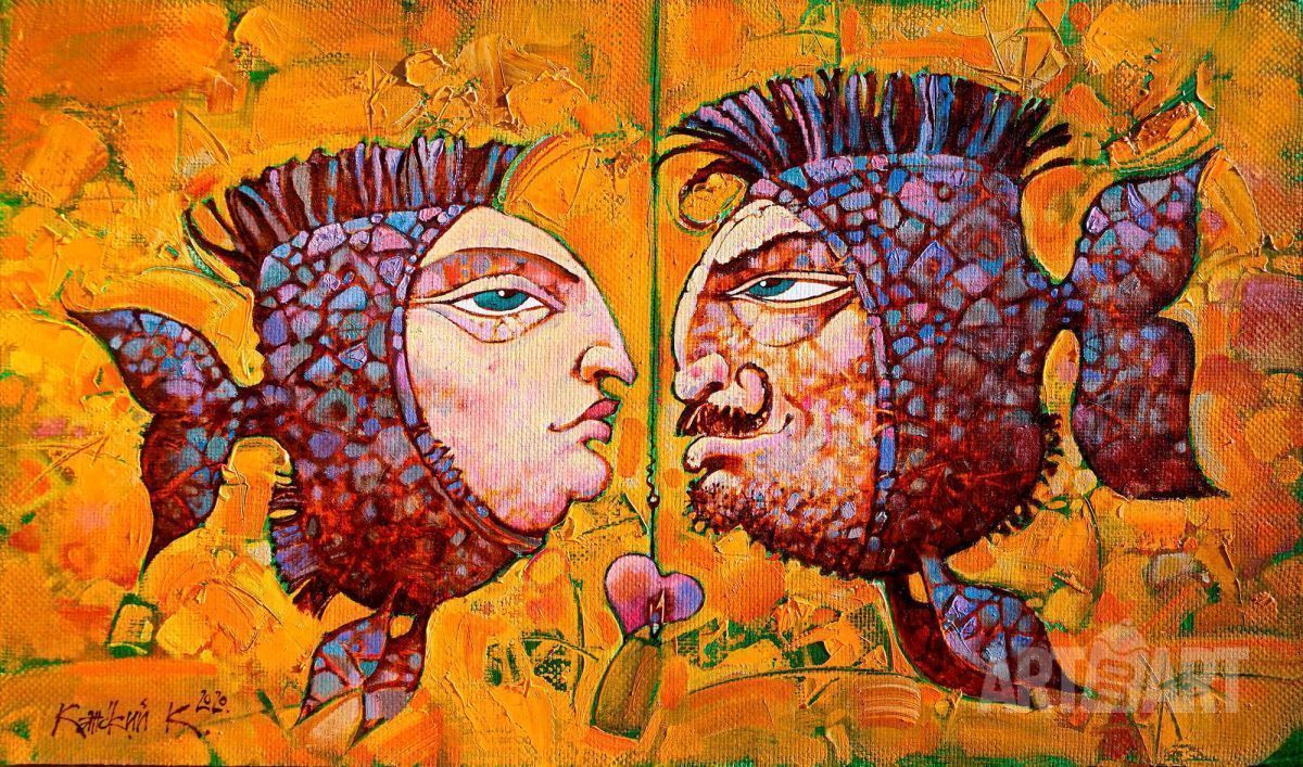The painting is based on the fairy tale «Beauty and the Beast». The monster needs to be kissed and then he will turn into a beautiful young man... prince. The pictorial work is a sign - symbol. The painting is made on Repin canvas .