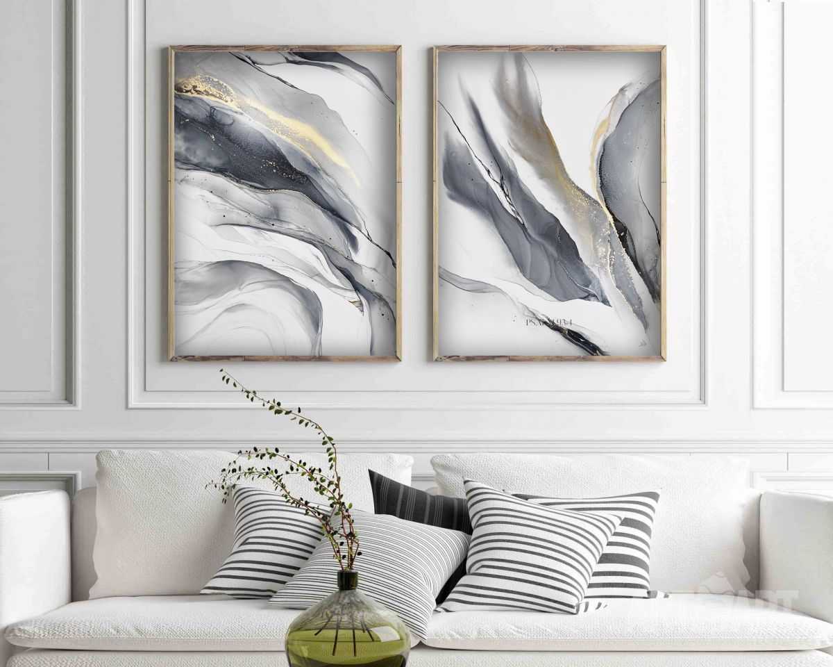 A black and white pair of interior abstractions with gold. A vegetative atmosphere in a transparent haze with graphic details, a scattering of black flies and shining gold metallic on the borders. A stylish composition in a neutral range for a modern interior in any colors. The paintings are combined on several sides, so they can be placed both vertically and horizontally. They are suitable for filling the space above the bed, sofa or table, and will also be a good gift for connoisseurs of beautiful interior accessories.