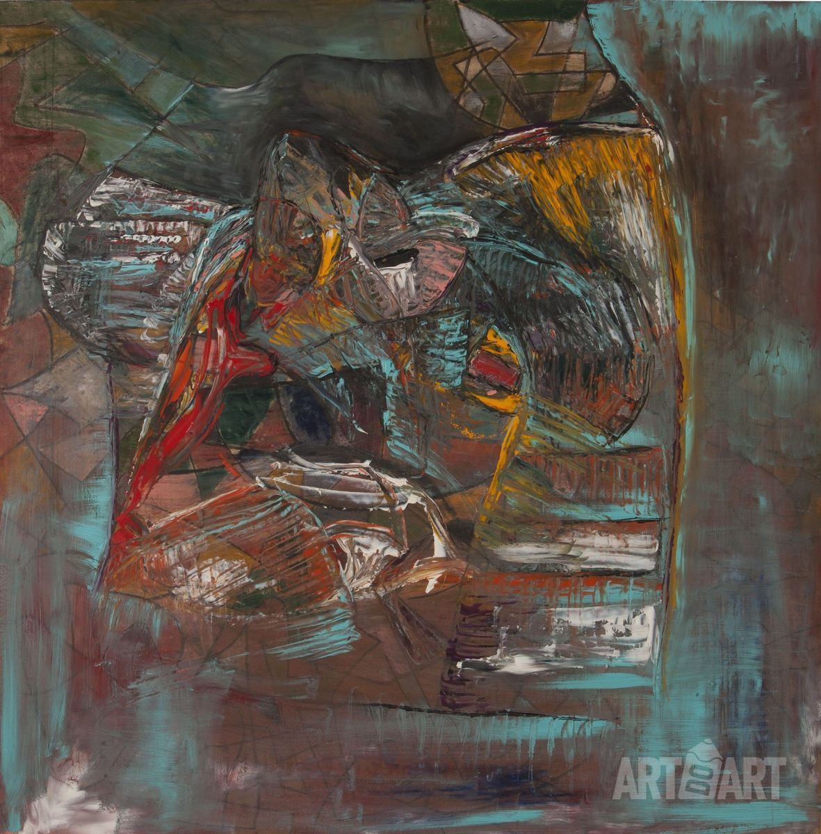The painting is made with oil paints on hardboard. Hardboard is pasted on a stretcher.