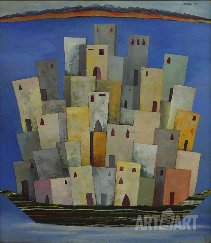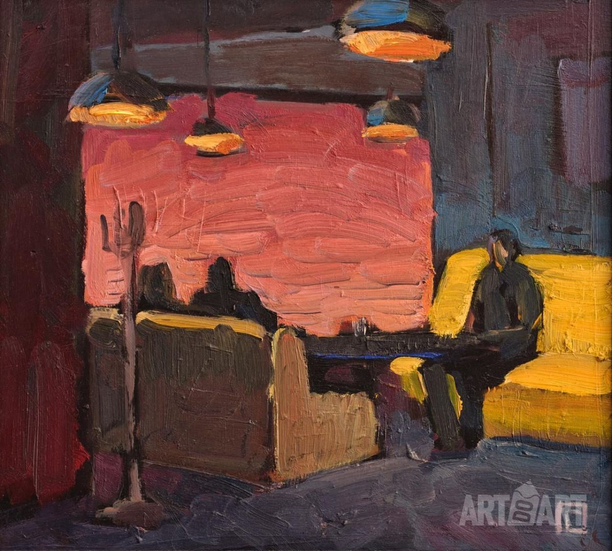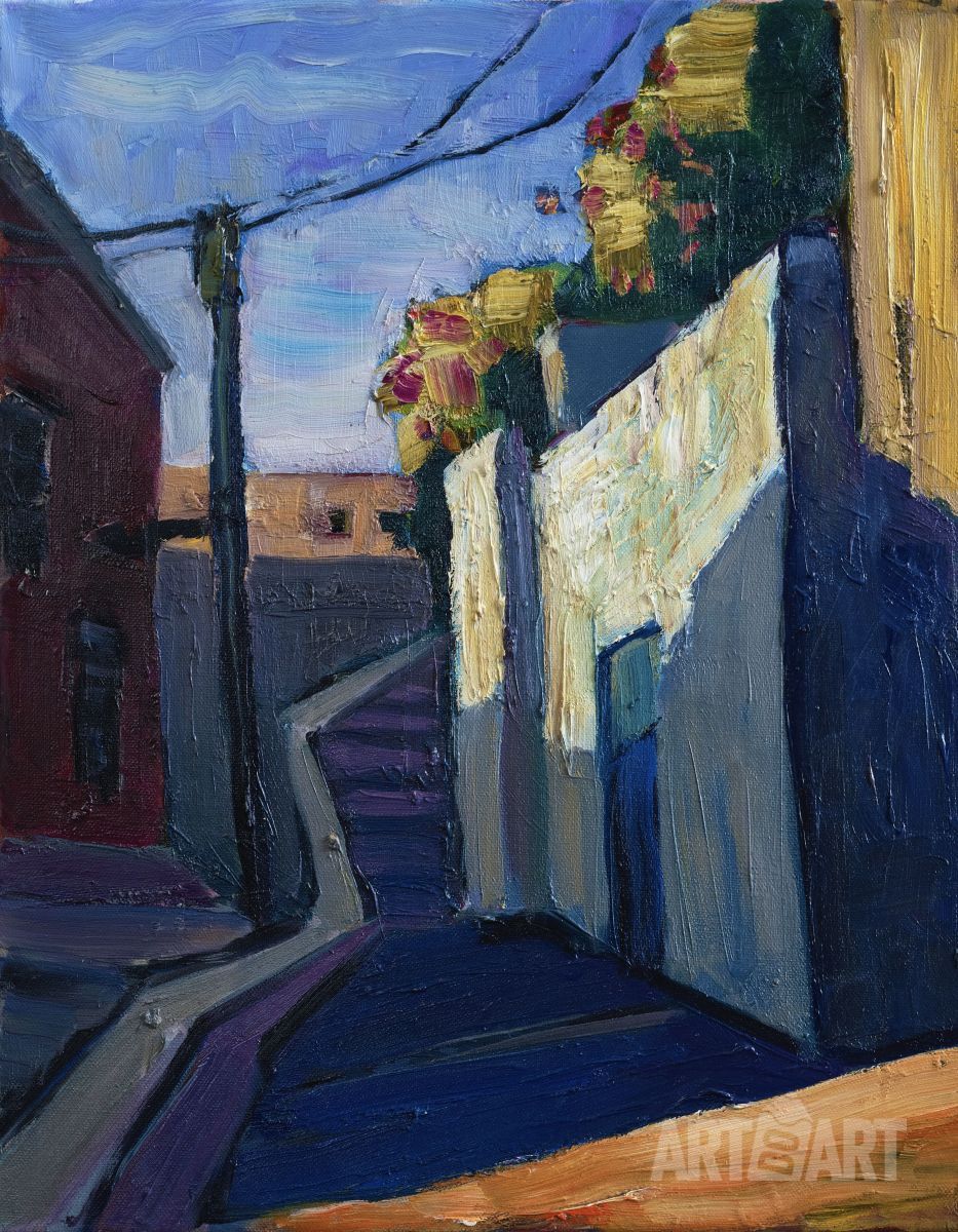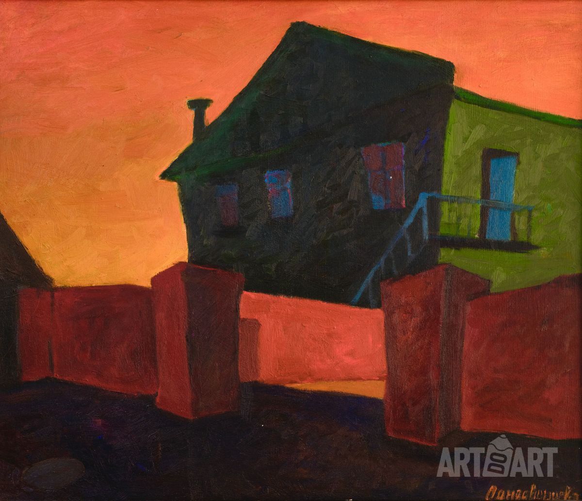 The work combines the depth of emotions and the simplicity of the architectural form. Using dense oil paints, the author has created a powerful visual image, at the same time brutal and expressive, which immerses the viewer in the atmosphere of a small town and its peaceful nature.