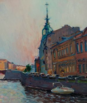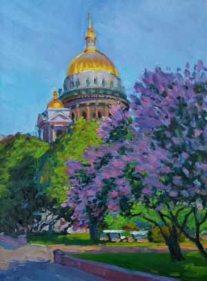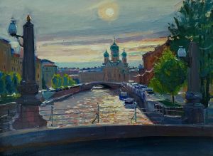 I painted this picture in early summer on the Moika River embankment in St. Petersburg. The fresh colors of sunny June: yellow, blue, green and lilac colors peacefully coexist with each other, creating the atmosphere of a quiet morning in St. Petersburg.