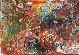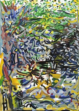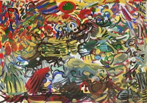 The work is executed in the style of Abstract Expressionism, on paper, gouache.