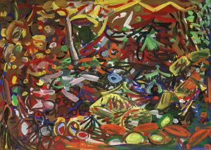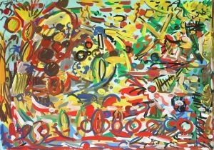 The work is executed in the style of Abstract Expressionism, on colored paper, gouache.