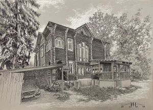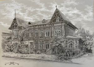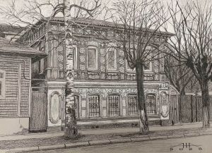 Grigoryevich Kupriyanov, a merchant of the second guild and a benefactor of the Tikhvin Church, who lived here with his wife and their 11 children. The house was built according to the project of architect I.M. Vasiliev.Tinted paper, gel pen, black graphite pencil, chalk. Size: 30x40cm.