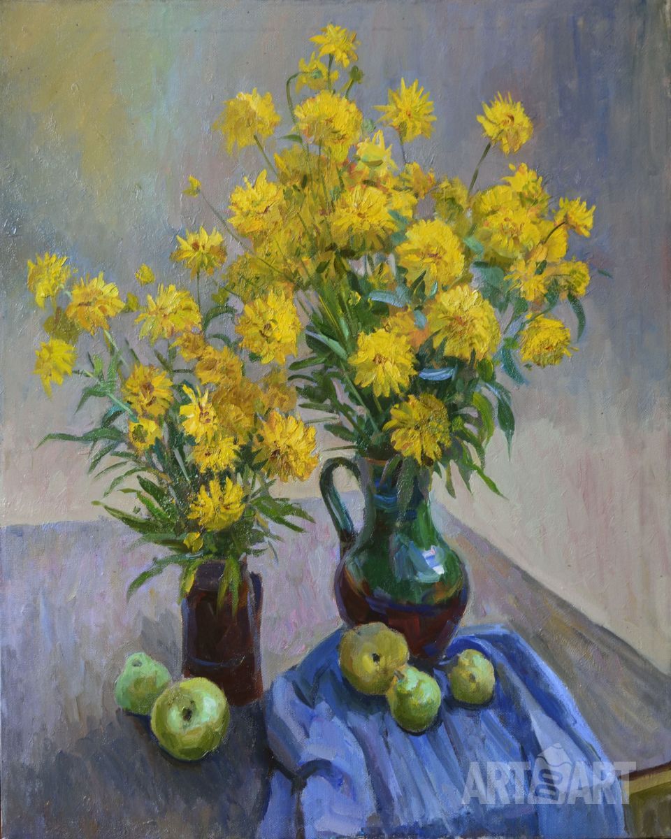 The work depicts bird cherry branches in a vase in the quiet atmosphere of the workshop's lobby. It is written from nature in spring, a blessed time. Base material : thick Repin canvas.