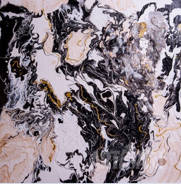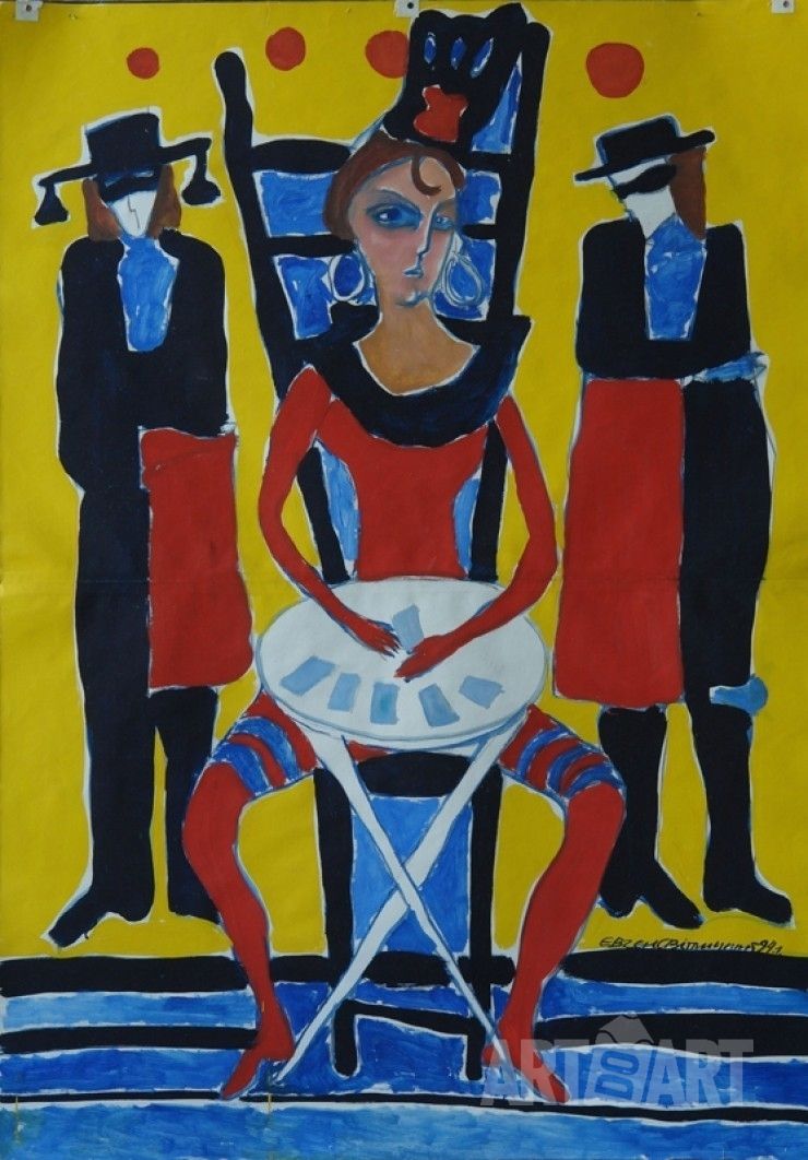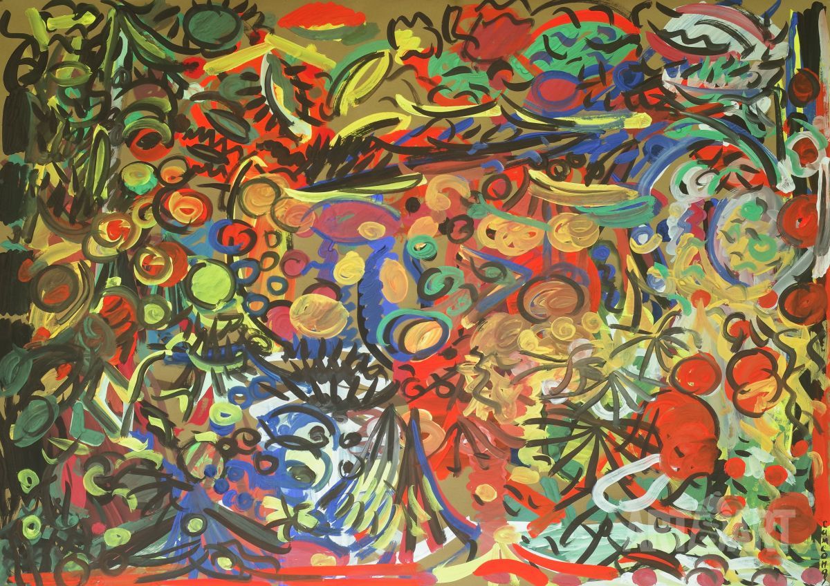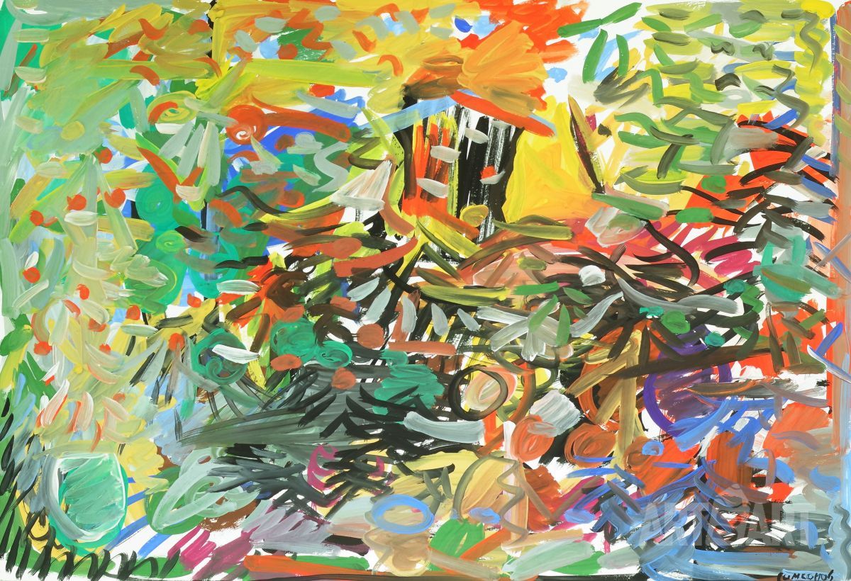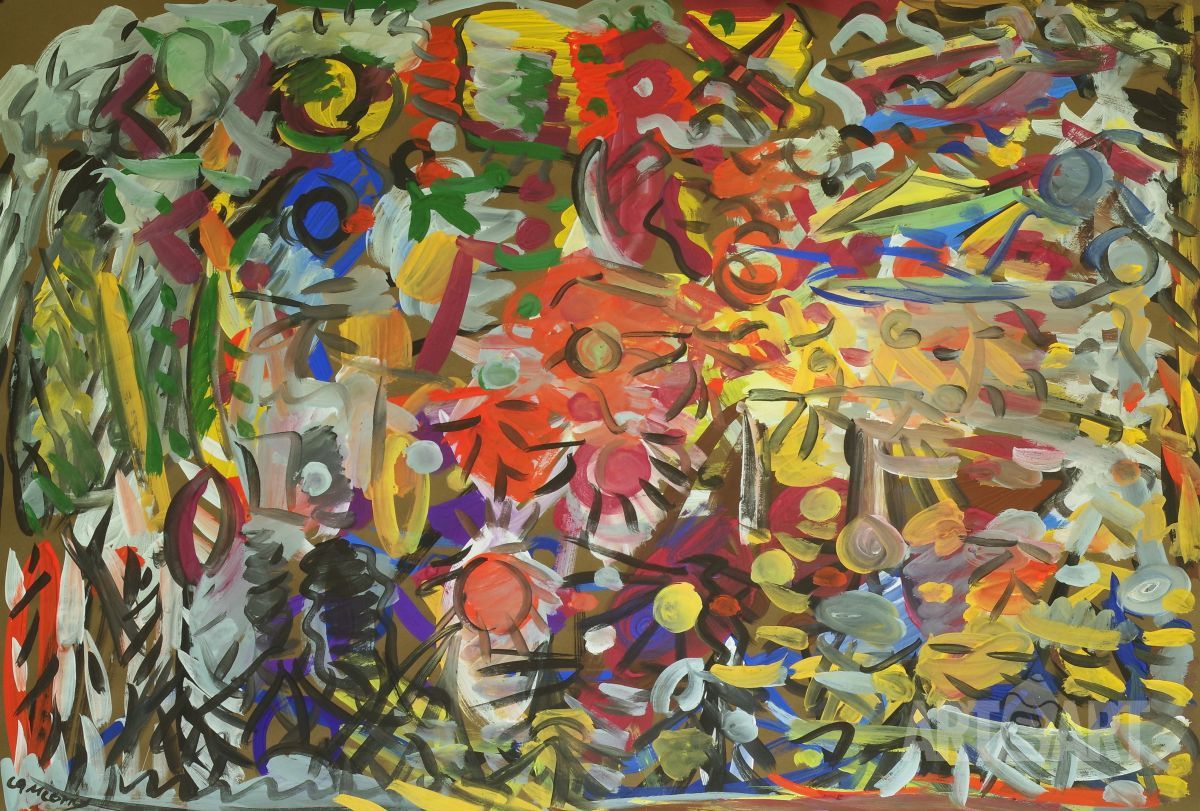 This work is executed in the style of Abstract Expressionism, on colored paper, using gouache.