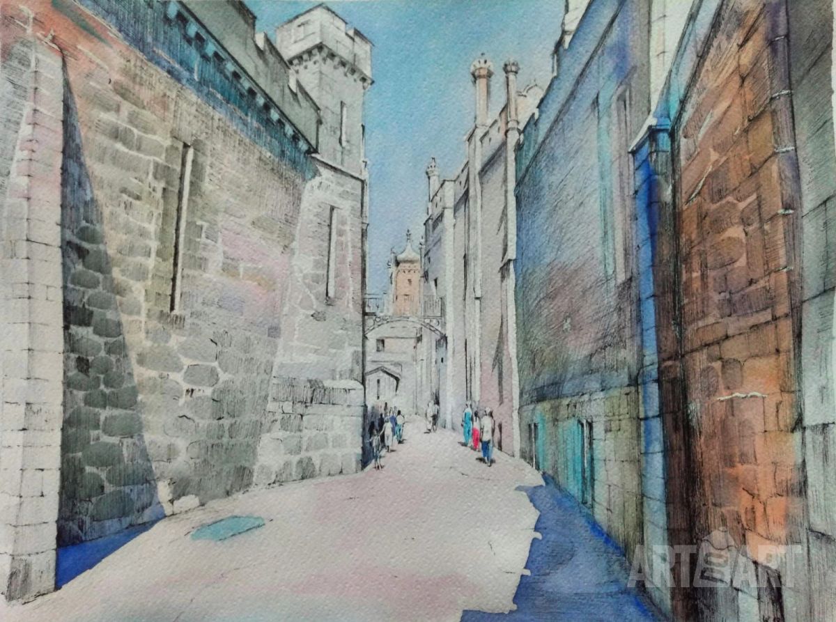 This watercolor painting depicts the shores of Lake Como, one of the most picturesque places in Italy. The composition centers on the surface of the water, reflecting the sky and coastal landscapes. Trees and shrubs line the shore, and the colorful houses, bathed in sunlight, capture the attention.
