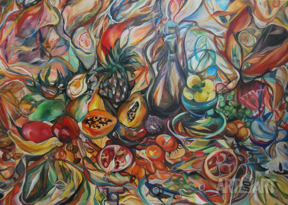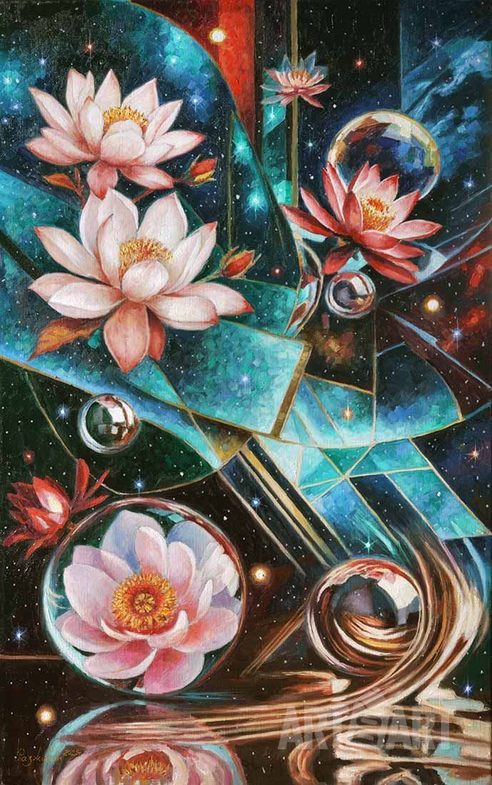 Still life, abstractionism, orchids, vase, space, neon lamps