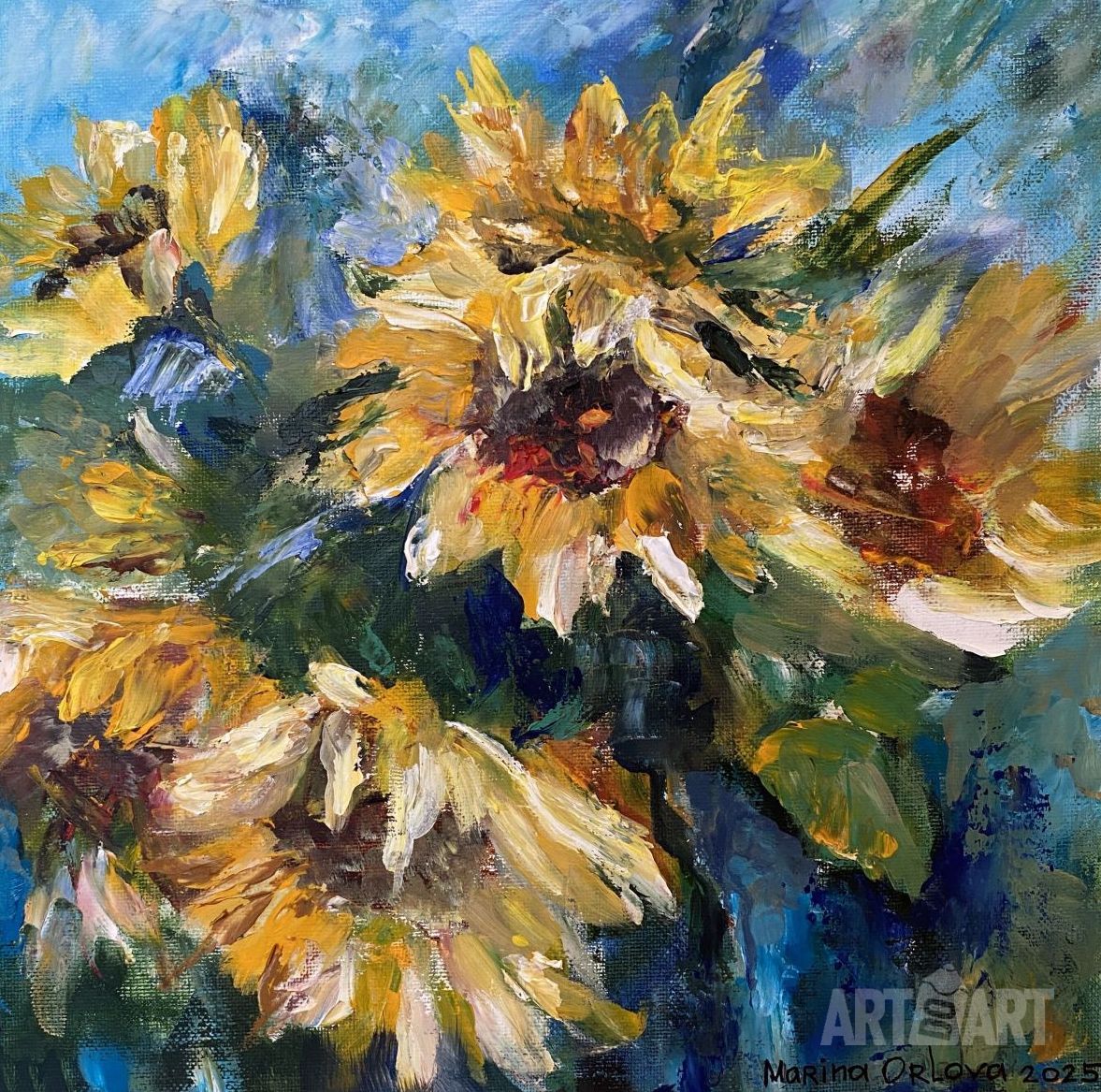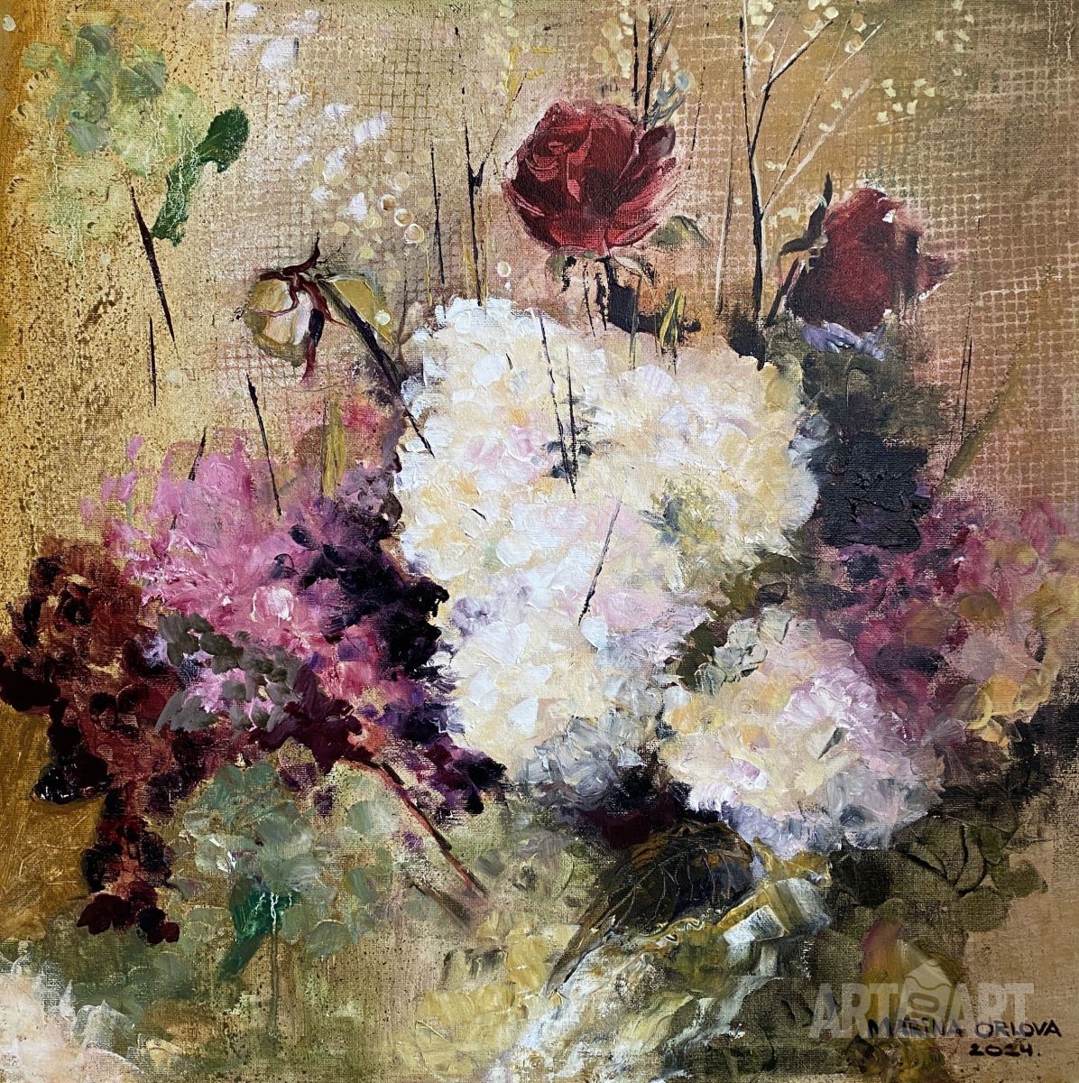 This 50x50 cm oil painting on canvas is the left part of the «Autumn» triptych and is a complex and multifaceted composition dedicated to the fading beauty of late flowers. The artist is Marina Orlova.