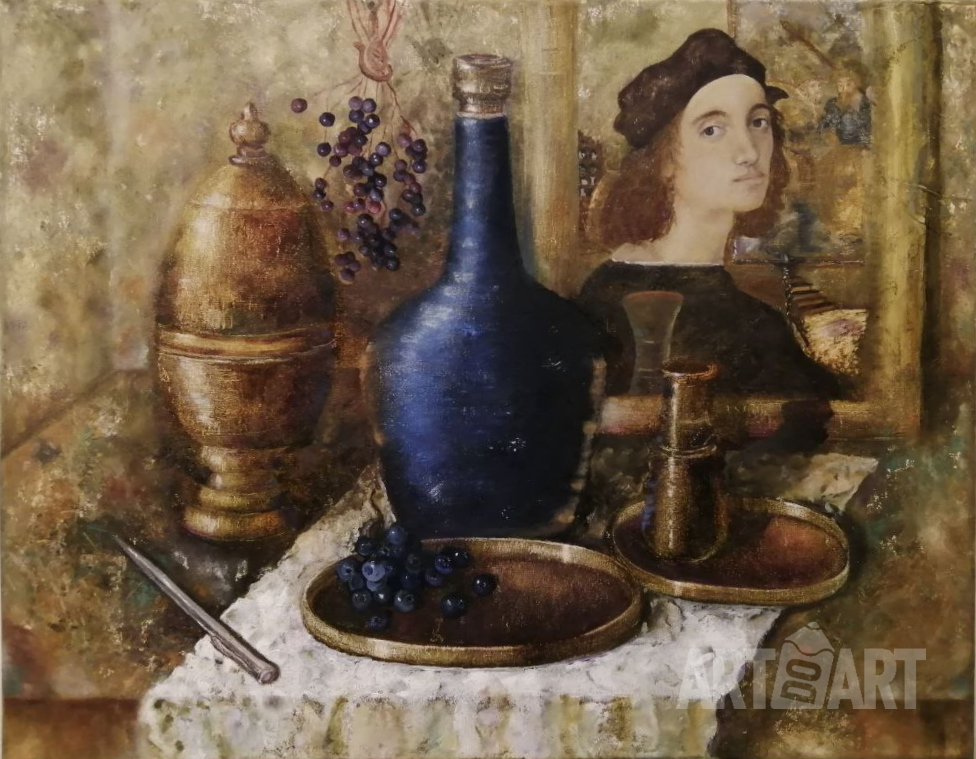 The work is painted in oil on a linen canvas on a stretcher. The sides of the painting are an extension of the painting, that is, they are painted over.