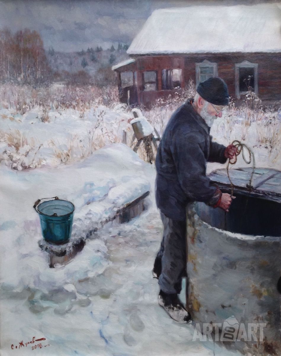 Выразительный получился старик, столько грусти и усталости в его глазах. А охотник наоборот, бодр и весел, возможно он даже немного выпил. Интересная картина, атмосферная, мне нравится.