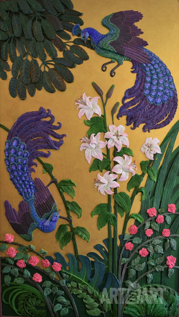 In this technique the object appears in a three-dimensional form, protruding from the background plane. Relief sculpture is usually created by using perspective technology and should be examined from the frontal point of view. Relief scuplture consists of several types: a bas-relief (the image protrudes slightly above the plane, not more than half of its volume), a high relief (the image extends essentially above the plane), a hollow relief or concave relief (the image is deepened into a plane) and a coel anaglyph (a contour carved onto a plane).